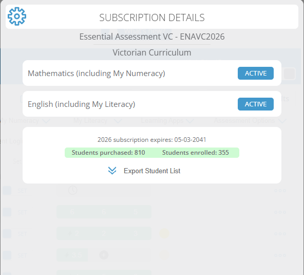 You can export a list of all the students that are currently active in your school. To do this, click the cog wheel and select Subscription Details.