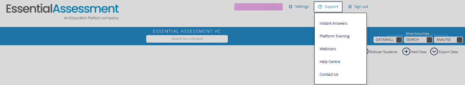 The Support button provides you with options for direct support.