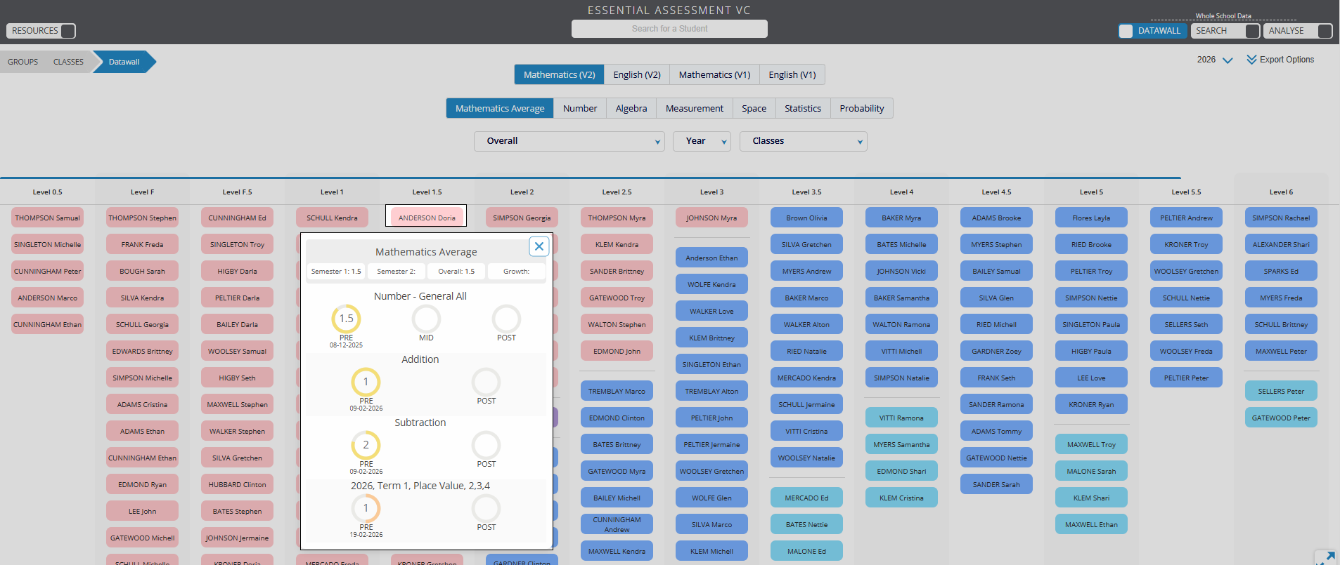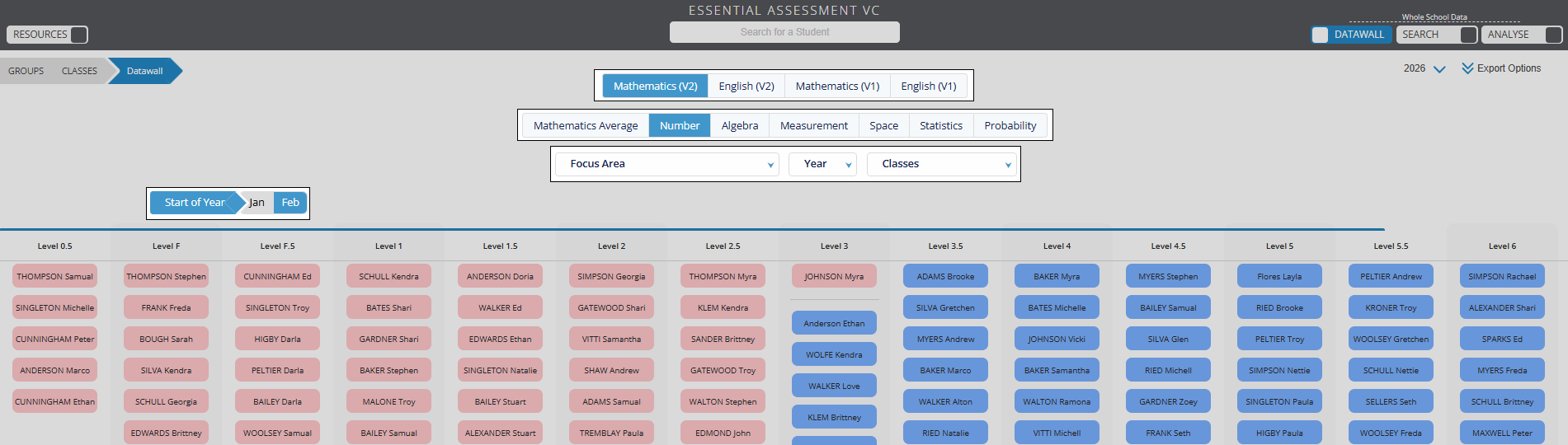 You're able to use the Data Wall function to display the current achievement level of each student within each strand of the curriculum.
