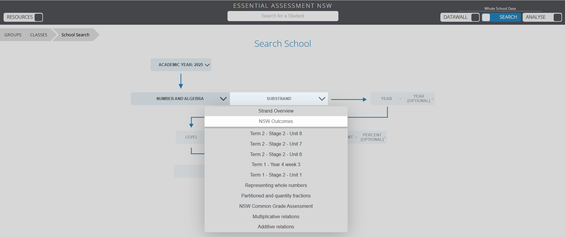 For our NSW subscribers, you will have the option to complete a search for NSW Outcomes data for a cohort. Once you have chosen the Strand, click NSW OUTCOMES under SUBSTRAND.