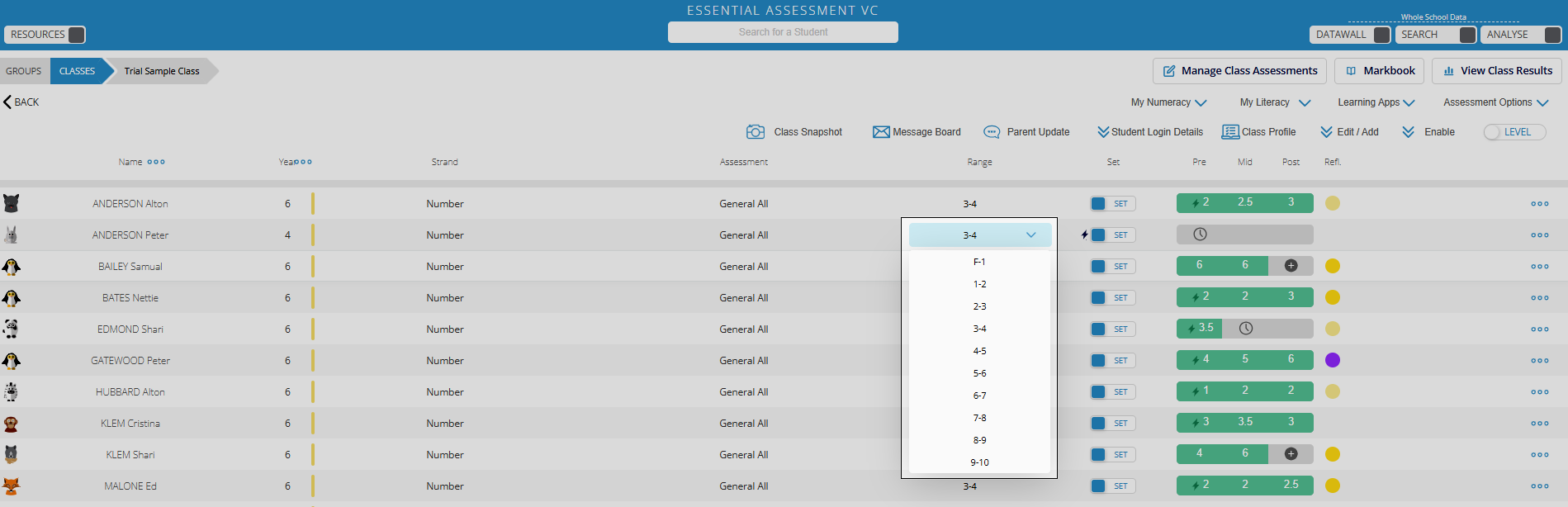 Select a class, and identify a student with the range of assessment you would like to export. Use the drop-down menu if required to adjust the range accordingly.
