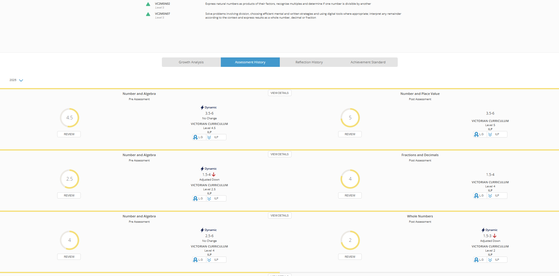 Below is a look at the Assessment History located within the student profile page, with dynamic assessments clearly visible.