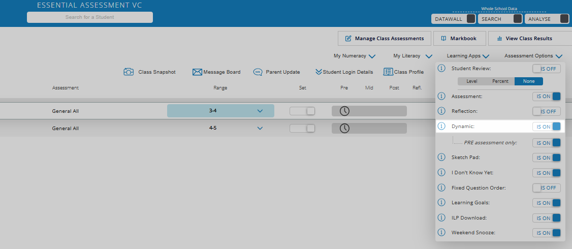 To turn on Dynamic, click on the class, click Assessment Options and switch the Dynamic toggle to IS ON.