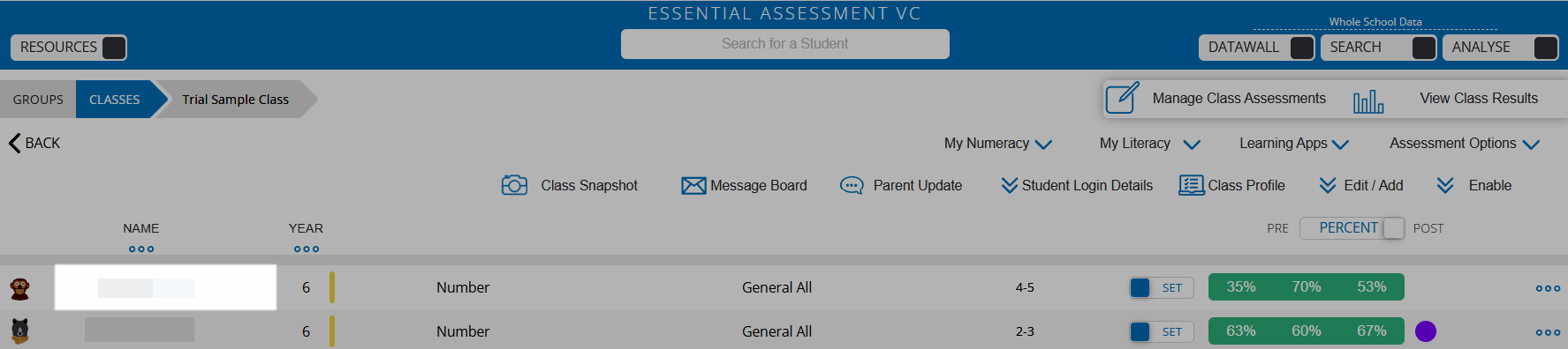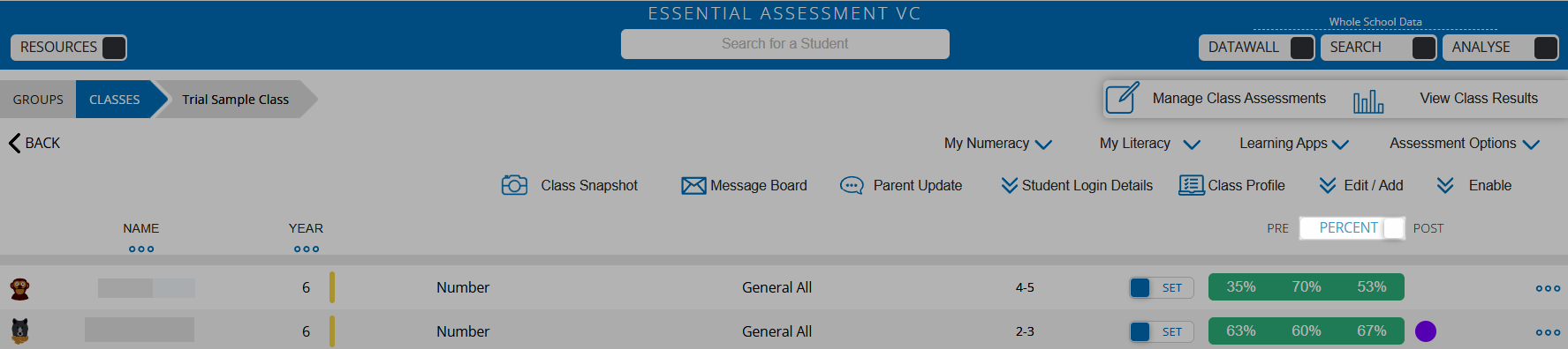Once you have clicked into a class, you can see a brief overview of student results. Switch the toggle to PERCENT to see the results in a percentage.