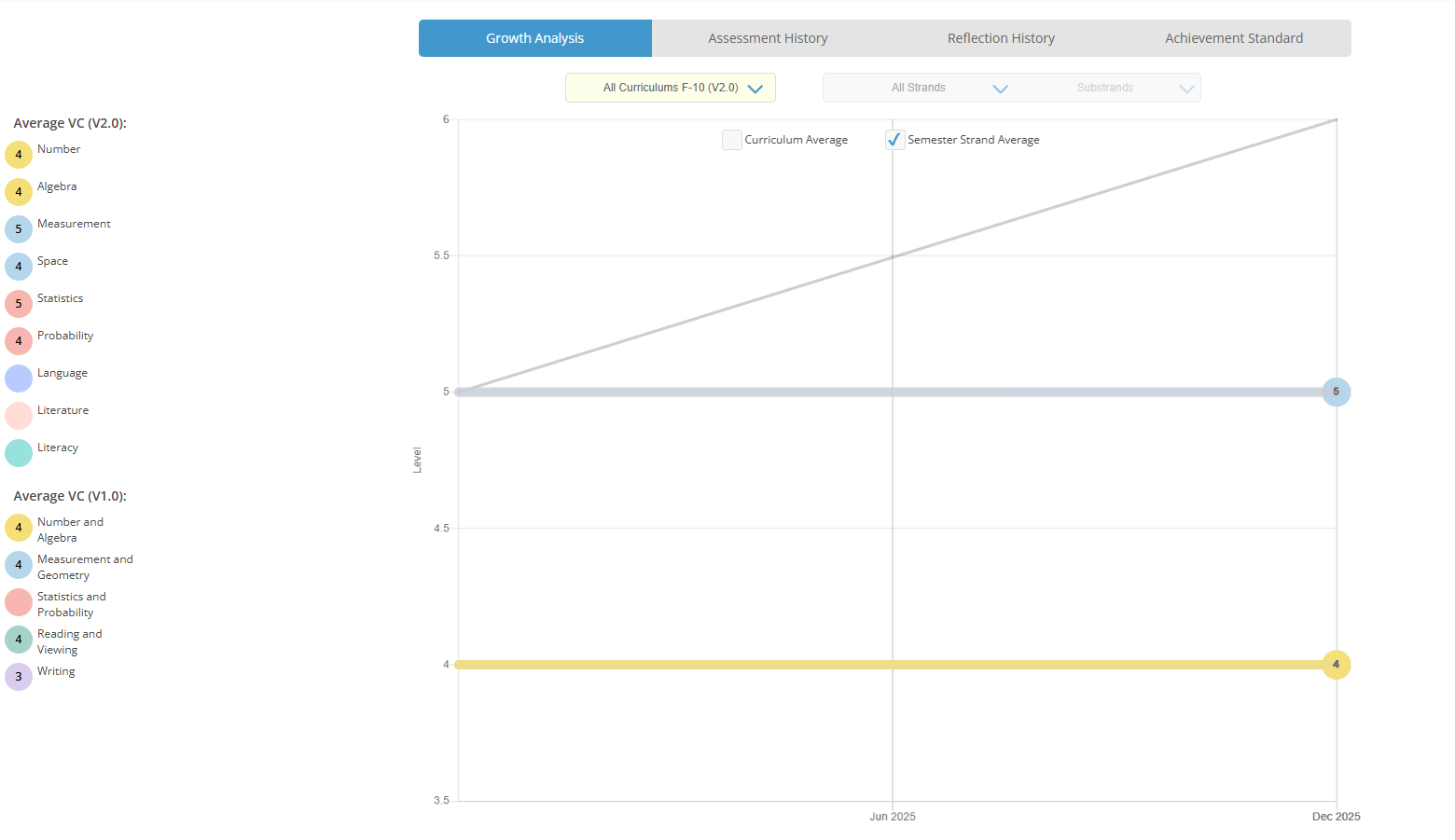 Scroll further down within the Individual Student Overview until you get to the GROWTH ANALYSIS section. The Growth Analysis graph enables you to see the student's growth compared to the expected level. You're able to filter the following depending on how you would like to see the data presented: