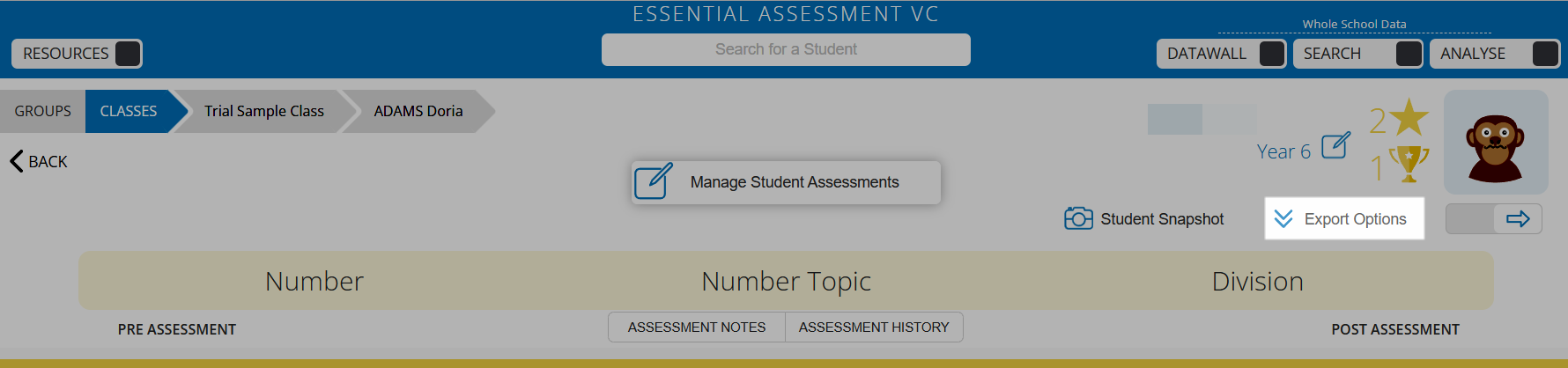 To see an overview of data for all assessments the student has completed, click into their class and then click on their name.