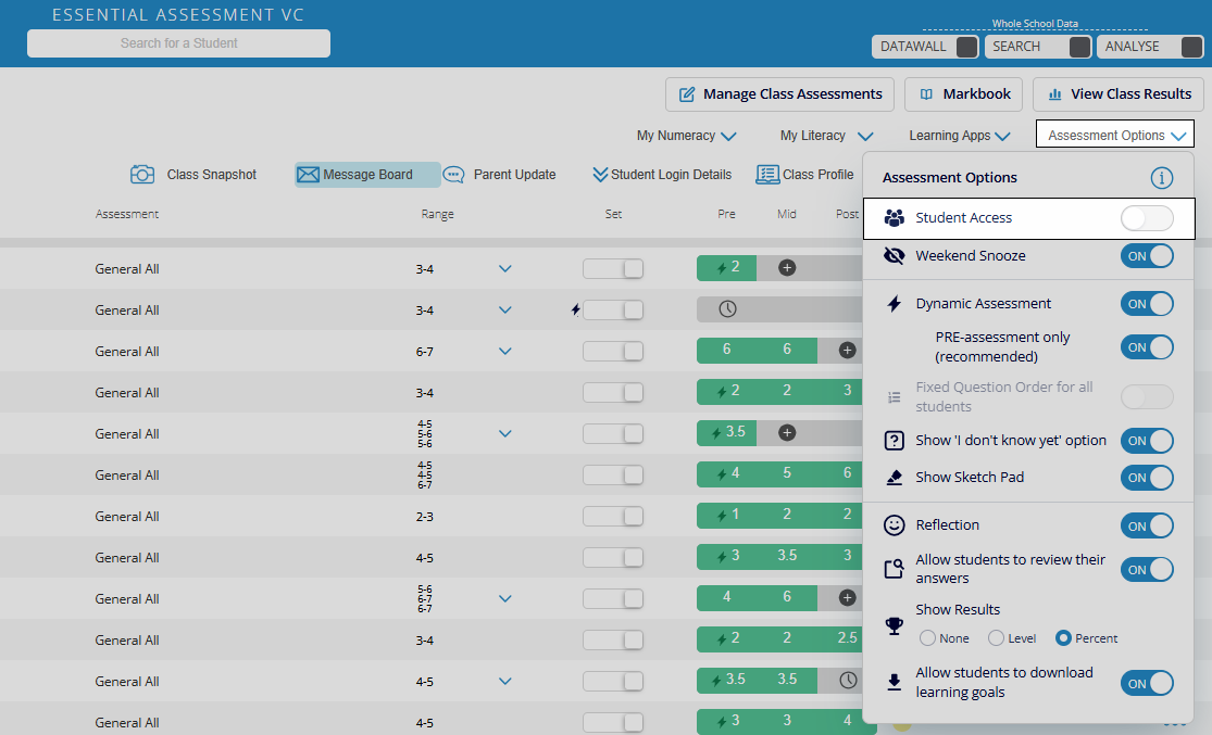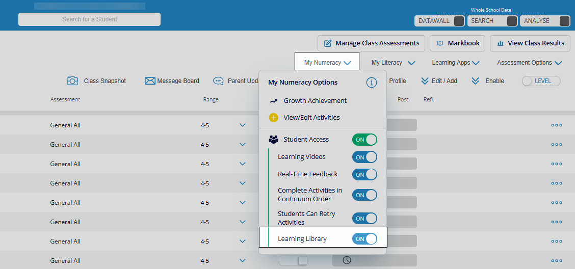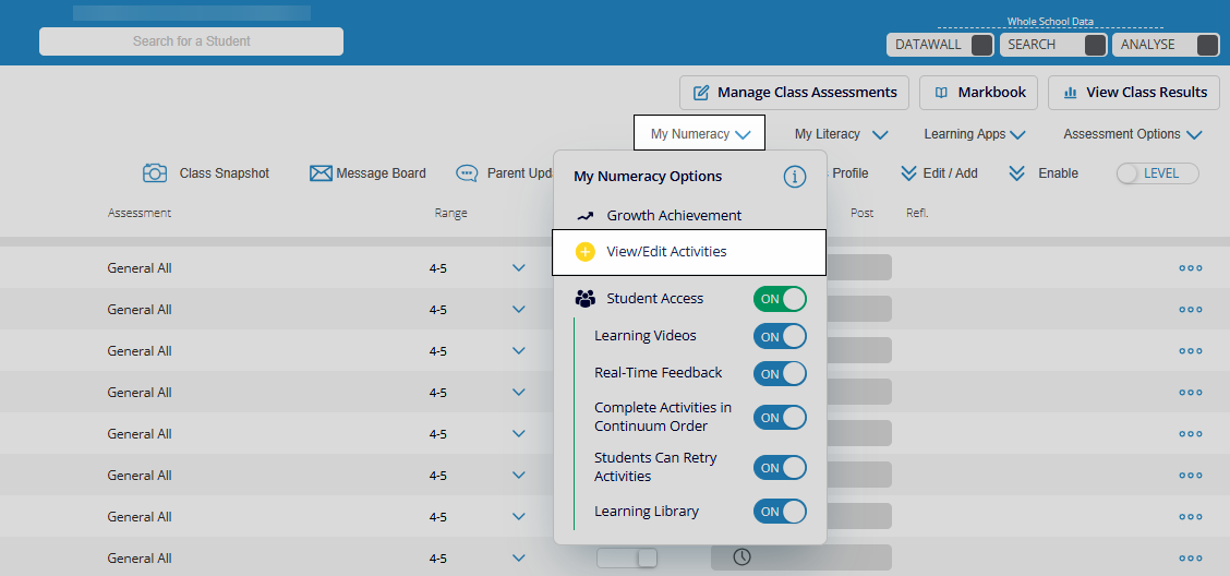 Ensure that the assessment has also been switched on under Manage Class Assessments for students to access the My Numeracy activities.