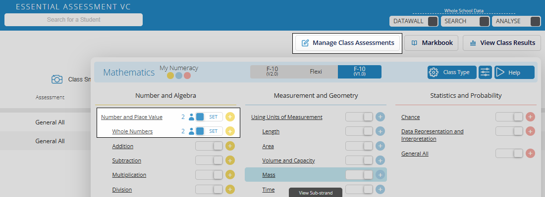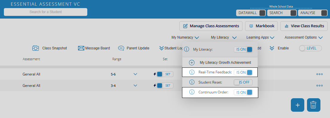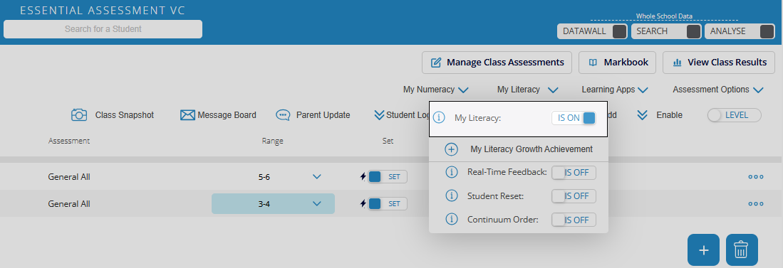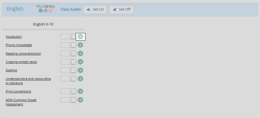 My Literacy activities can be set prior to students completing the pre-assessment. Click Manage Class Assessments and then click the coloured circle with the + icon.