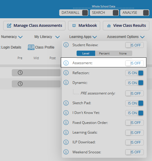 If you don't want your students to see the pre-assessment until they have completed their activities, you can turn the assessment off by switching the toggle to IS OFF under Assessment Options. Please note that doing this will turn off any assessment that has been enabled in the class.