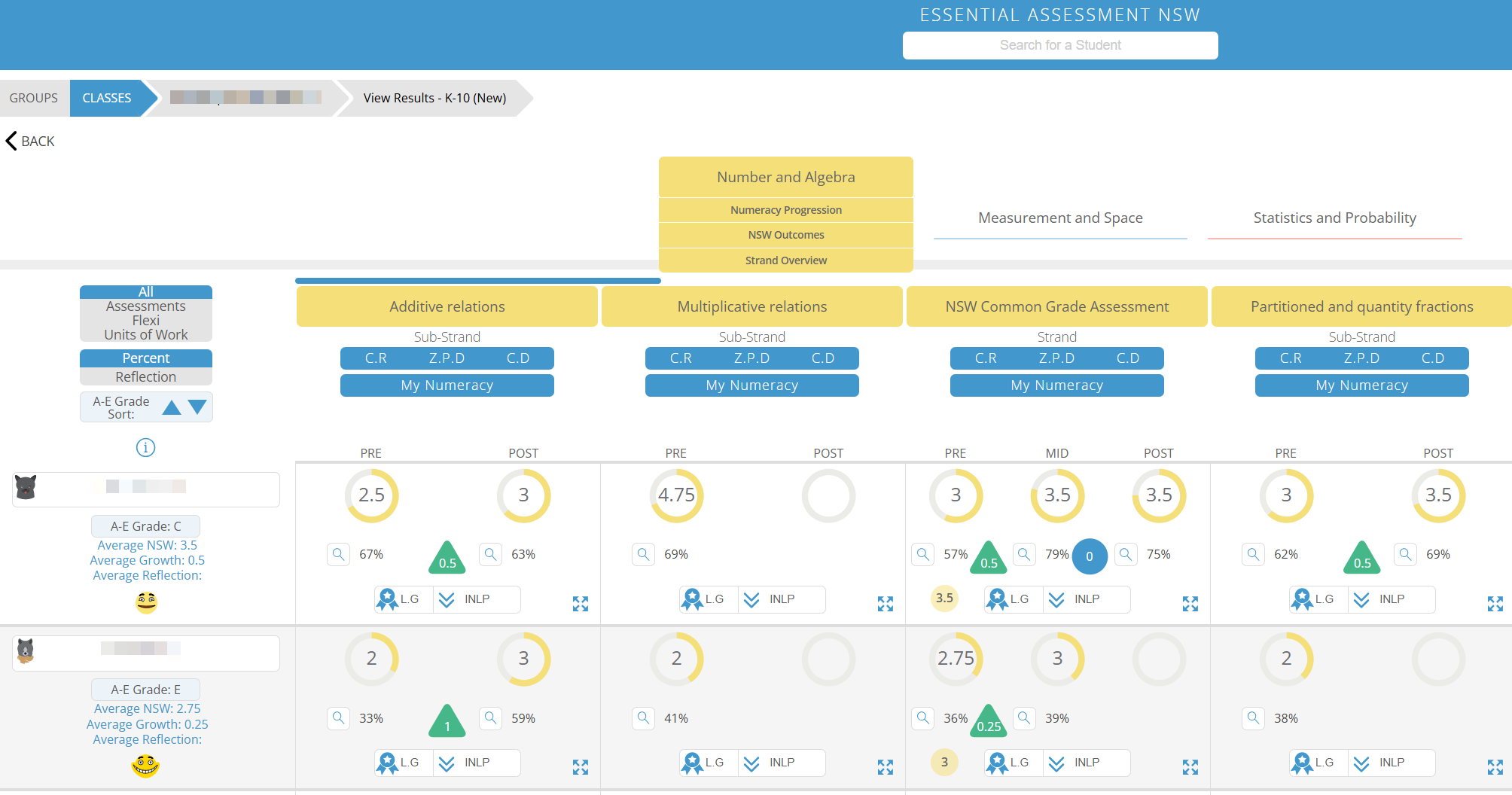 Click on the NSW Outcomes tab to view a summary of data for each Focus Area from that strand. The outcomes tab illustrates the percentage of the class who have shown understanding within that Focus Area. This is the benefit of completing a Common Grade Assessment. Throughout the year, the percentages will continue to update as data is collected from the Focus Area assessments and the mid and post-assessments for the NSW Common Grade.