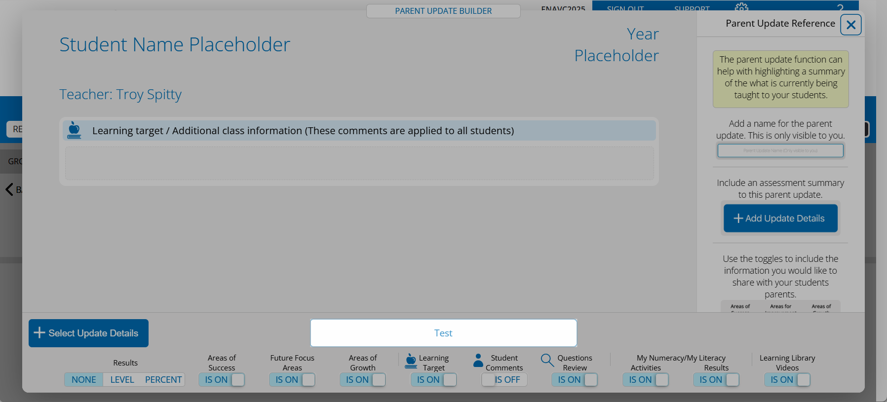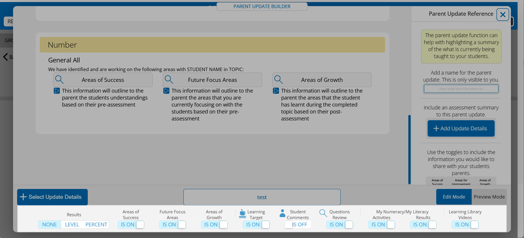 Switch the toggles at the bottom of the Parent Update Builder to IS ON or IS OFF, depending on what information you would like to include.