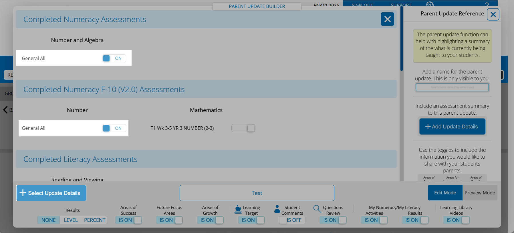 From here, click + Select Update Details. Switch the toggle to ON for the assessment data you would like to include.