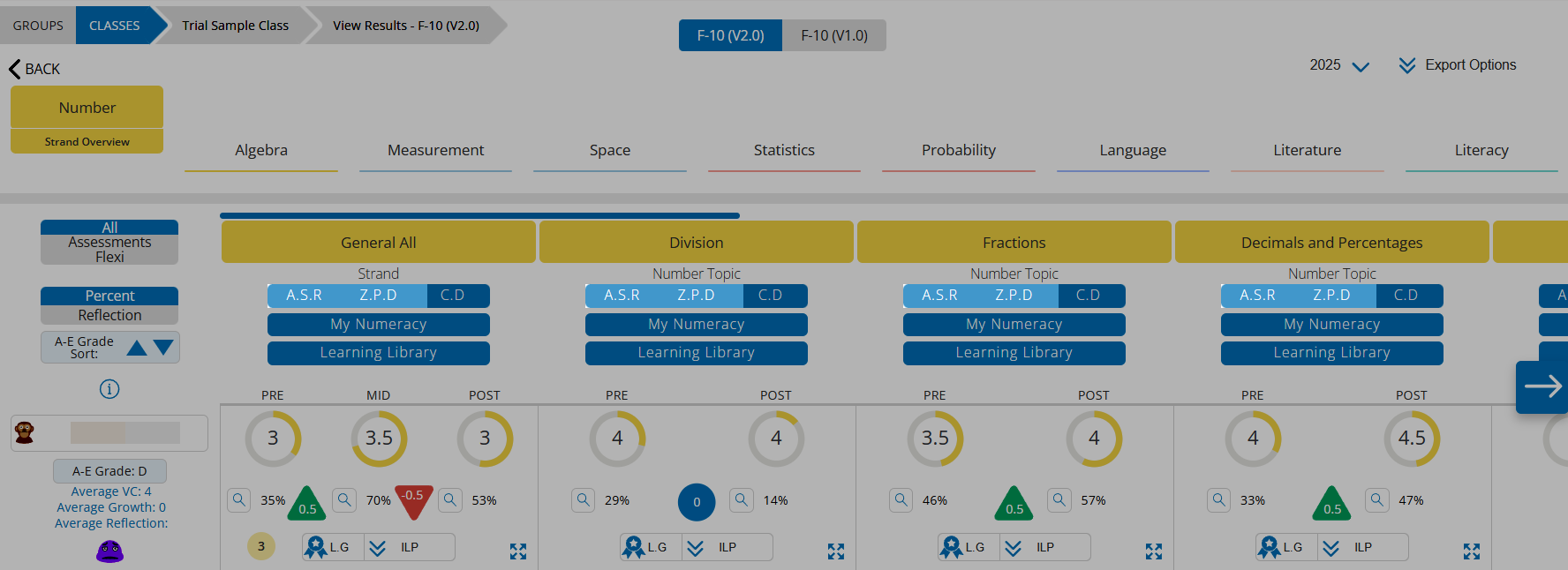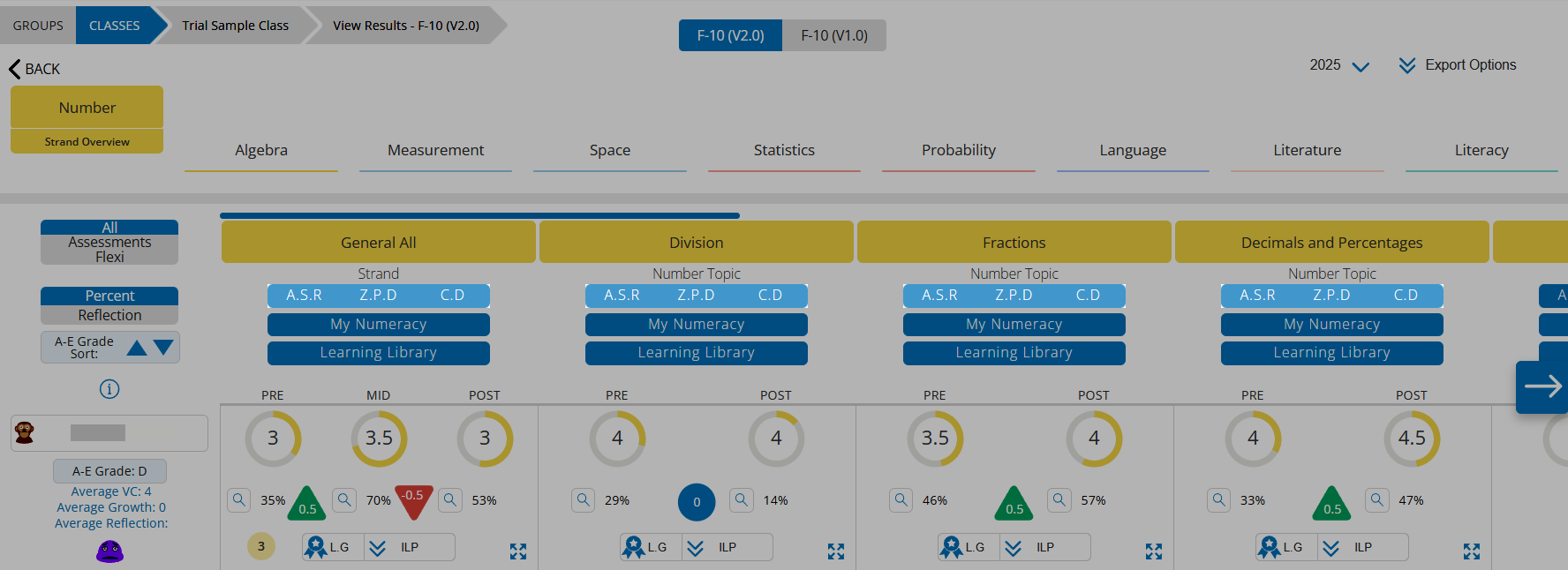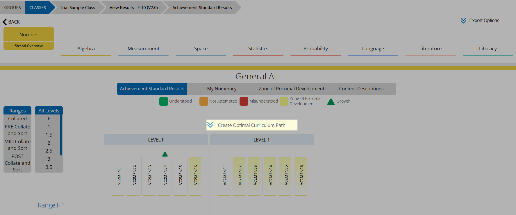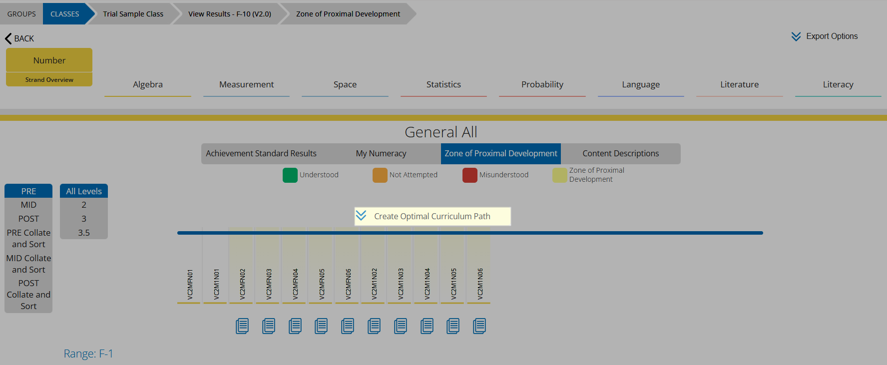 Within the Achievement Standard Results (A.S.R) and the Zone of Proximal Development (Z.P.D) data views, you can export an optimal curriculum pathway that generates a series of worksheets for your class based on their misconceptions from the pre-assessment. The Optimal Curriculum Path will show the students' names under the ranges they were assessed, followed by Learning Plans that align with common misunderstandings for that group of students.