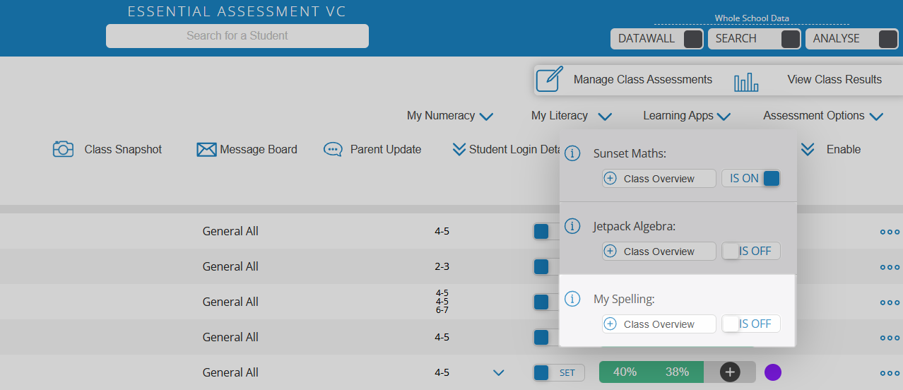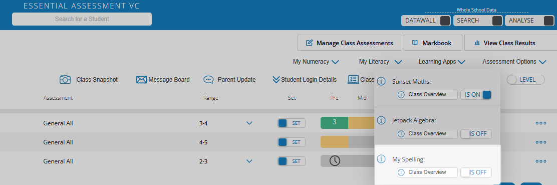 My Numeracy and My Literacy activities are tied to assessments. You will need to ensure that the assessment the activity is tied to is switched to SET under Manage Class Assessments:
