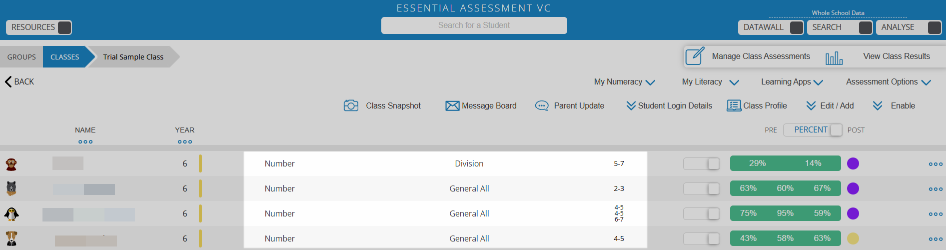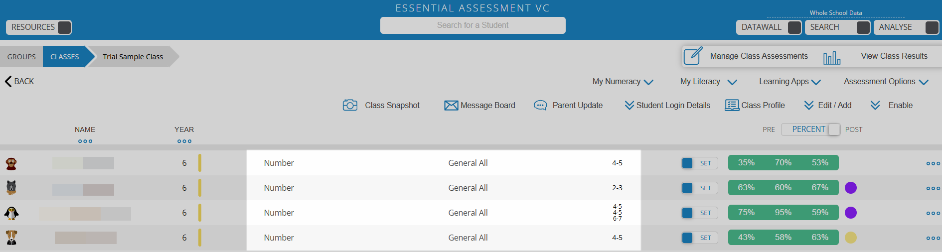 When a teacher clicks into an individual student and clicks Manage Student Assessment, this will change the assessment viewable on the class overview screen for the student. An example of what this looks like is below: