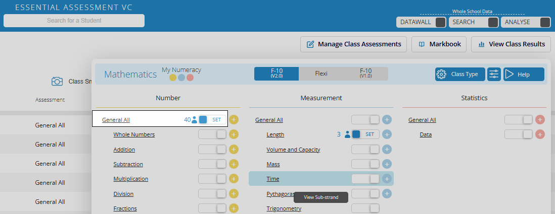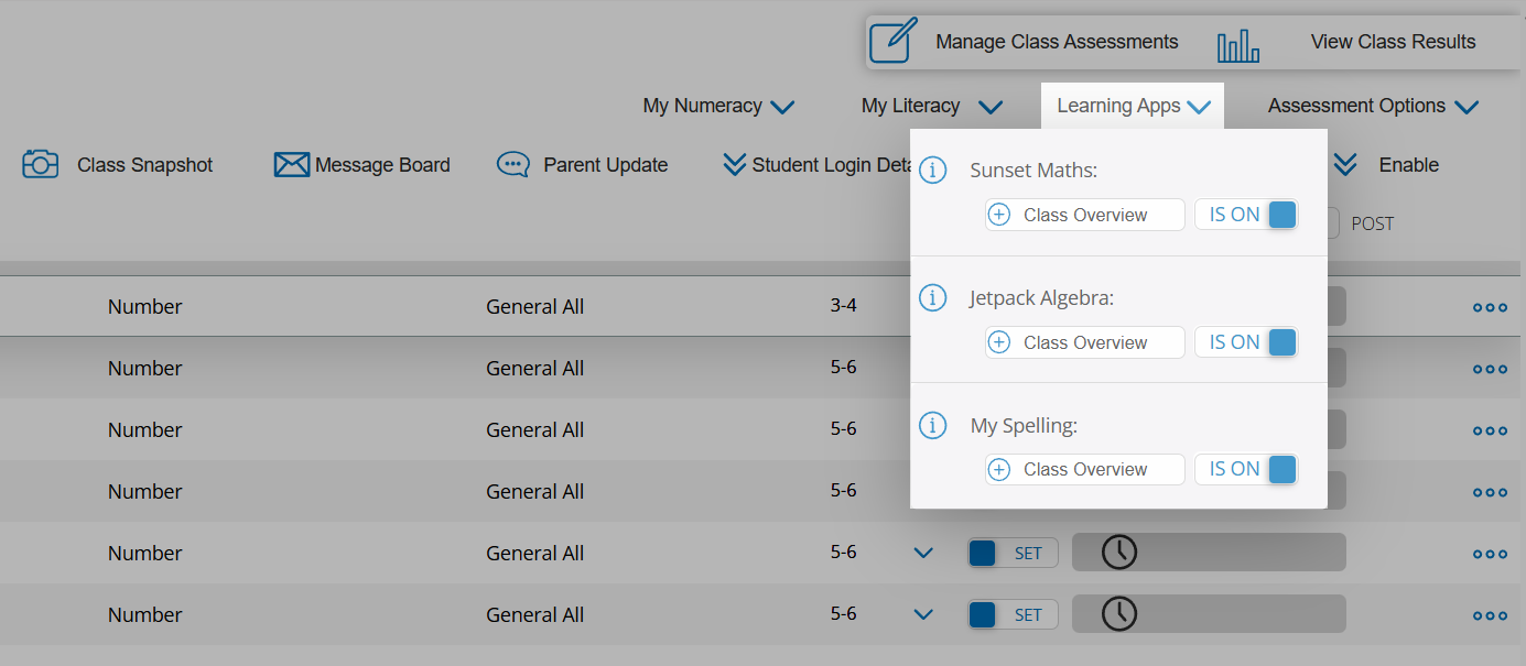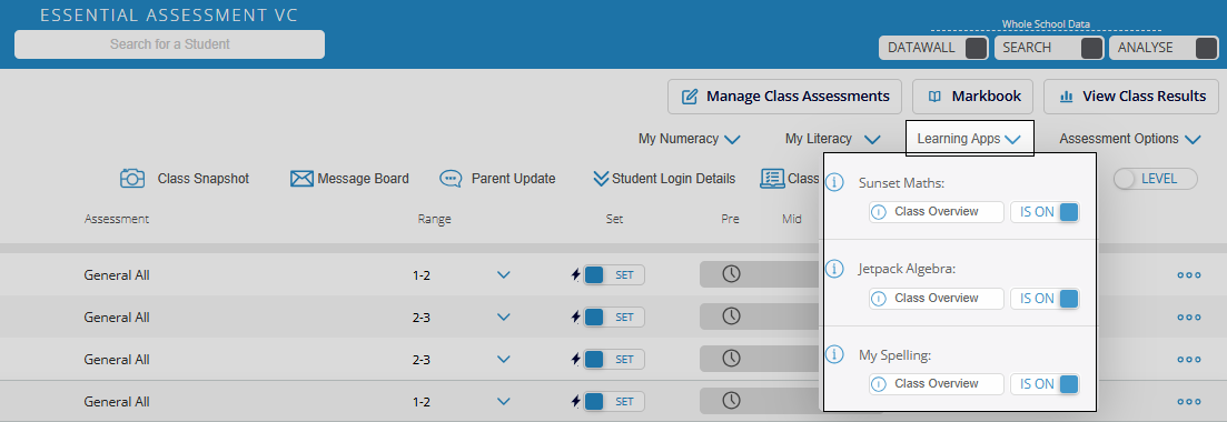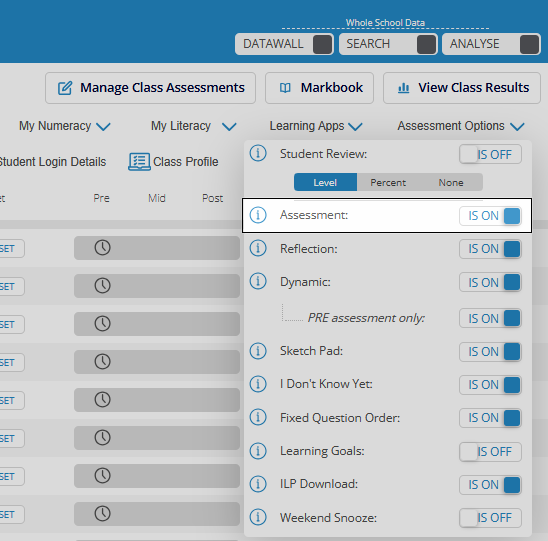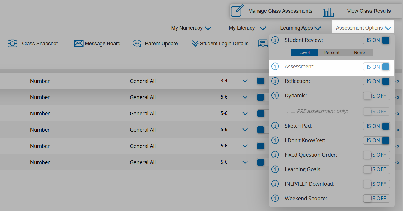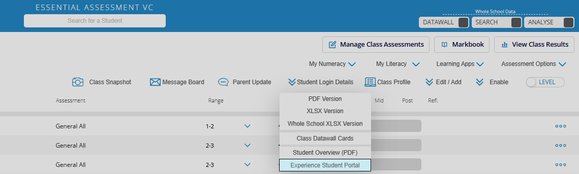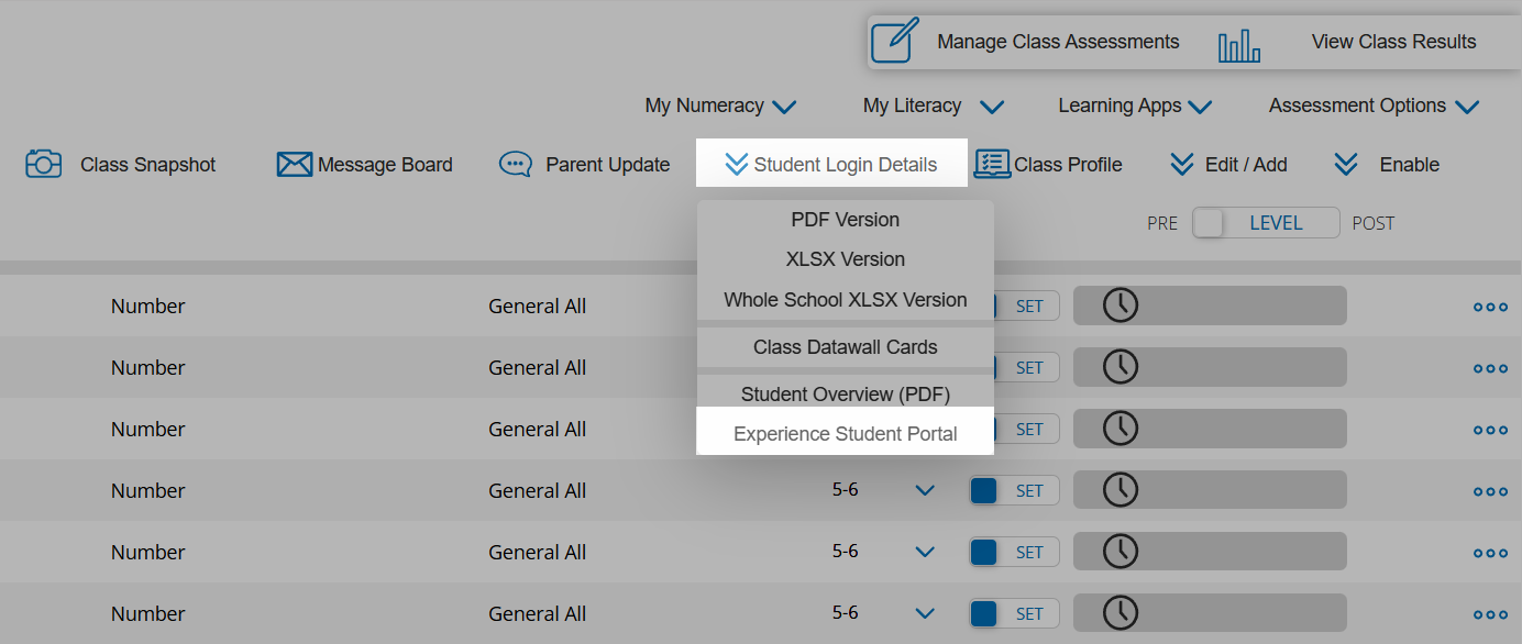 Before accessing the student portal, it's important to make sure everything is set correctly. Click into your chosen class and select Manage Class Assessments. Check which Assessments are in the SET position.