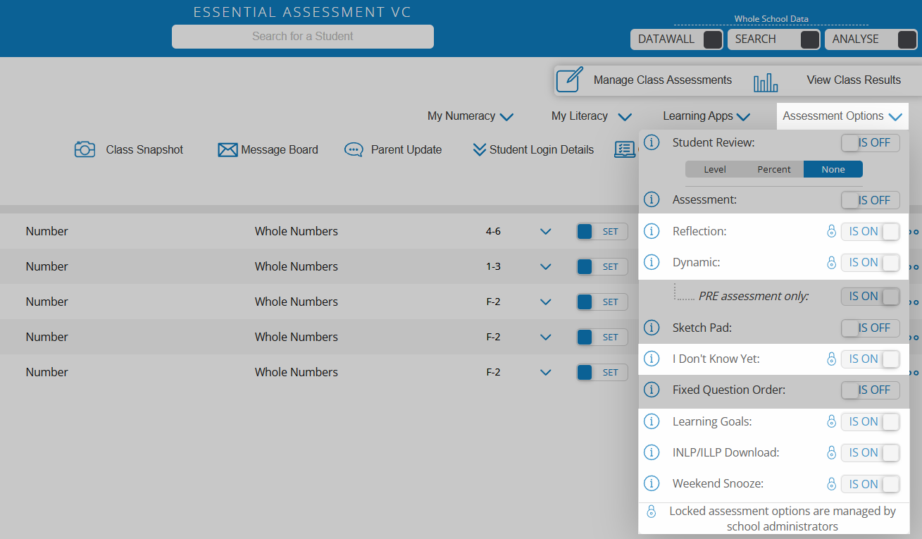 When teachers access their assessment options screen, they will see which options are LOCKED and which options can be turned ON/OFF according to the needs of their class.
