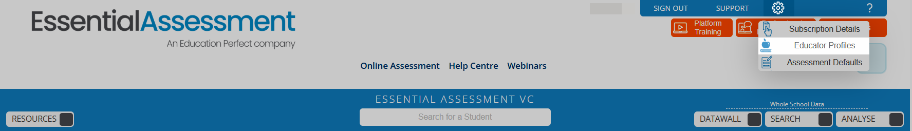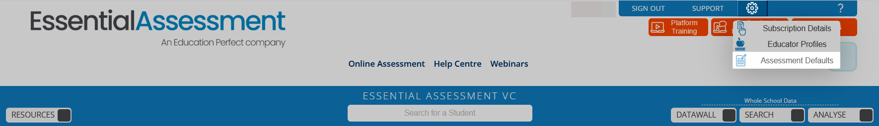 Once the nominated educator logs in to Essential Assessment, they can access the Administrator Defaults tab by selecting Online Assessment and the Cog Wheel.