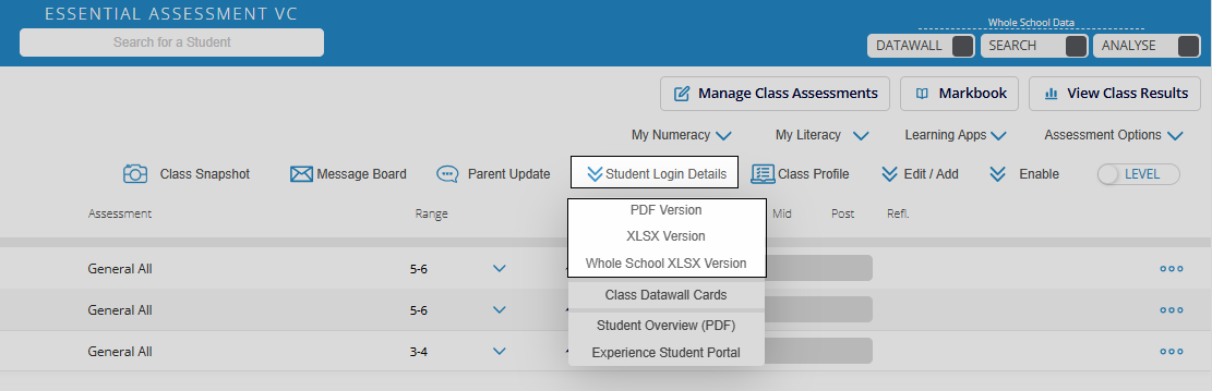 The PDF Version and XLSX Version pertain to login credentials in the selected class. Selecting Whole School XLSX Version will download all student passwords at your school.