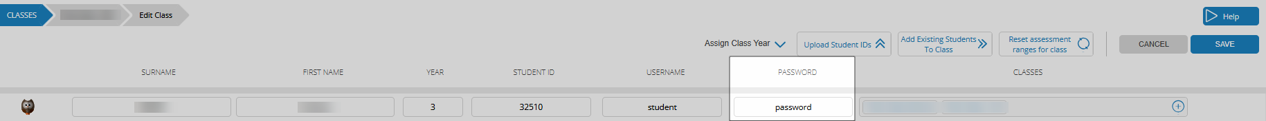 Under PASSWORD, you will be able to see a list of all students' current passwords. If you would like to update them, just click on the box and type the new password. Once you have entered the new password, click SAVE.