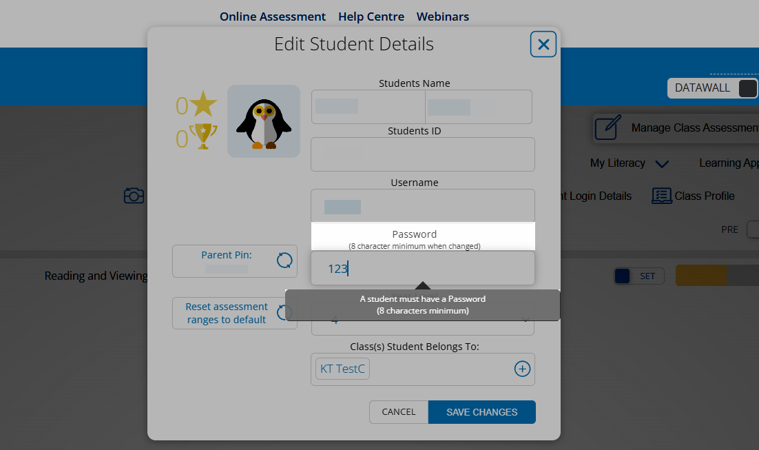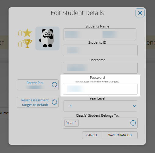 Under PASSWORD, you will be able to see the student's current passwords. If you would like to update the password, just click on the box and type the new password. Once done, click SAVE CHANGES.