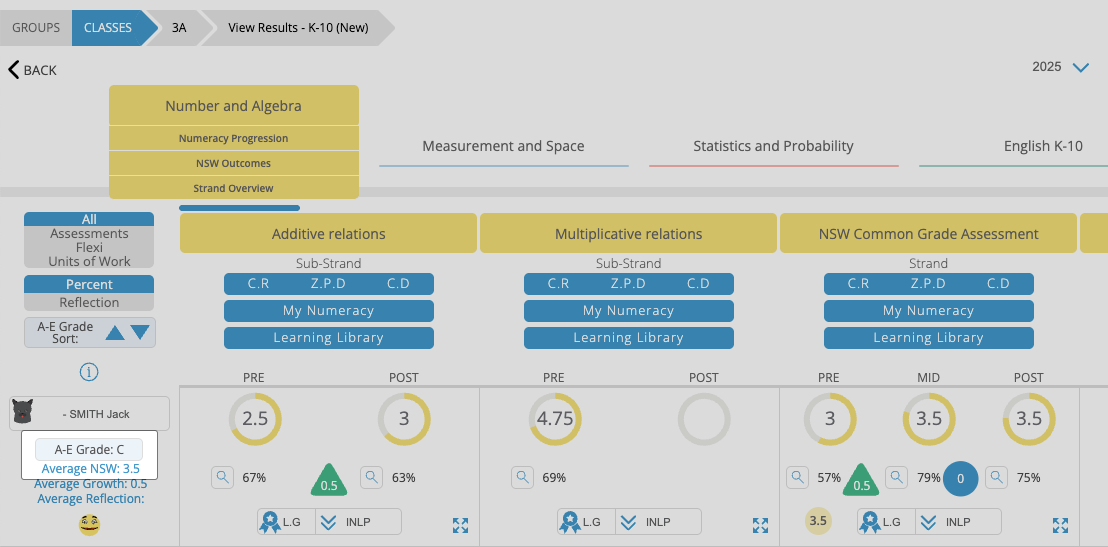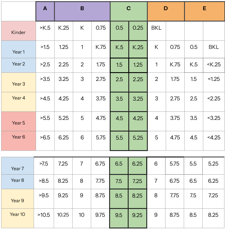 A-E grading is in accordance with the average progression point (Average NSW), in relation to the time of year. These generate on the left-hand side.