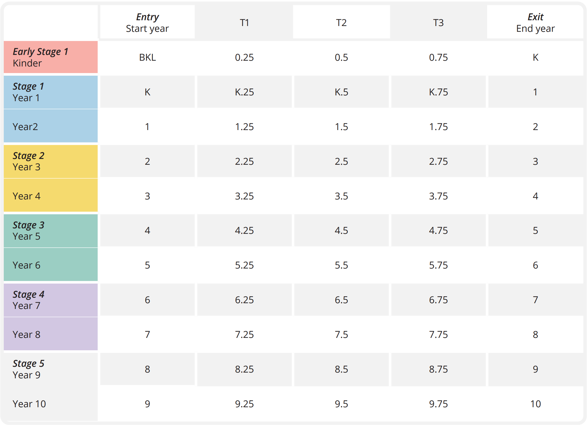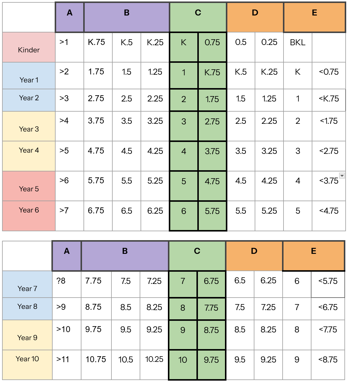 The following tables demonstrate how A-E grading is calculated in relation to the progression point, based on the time of year.
