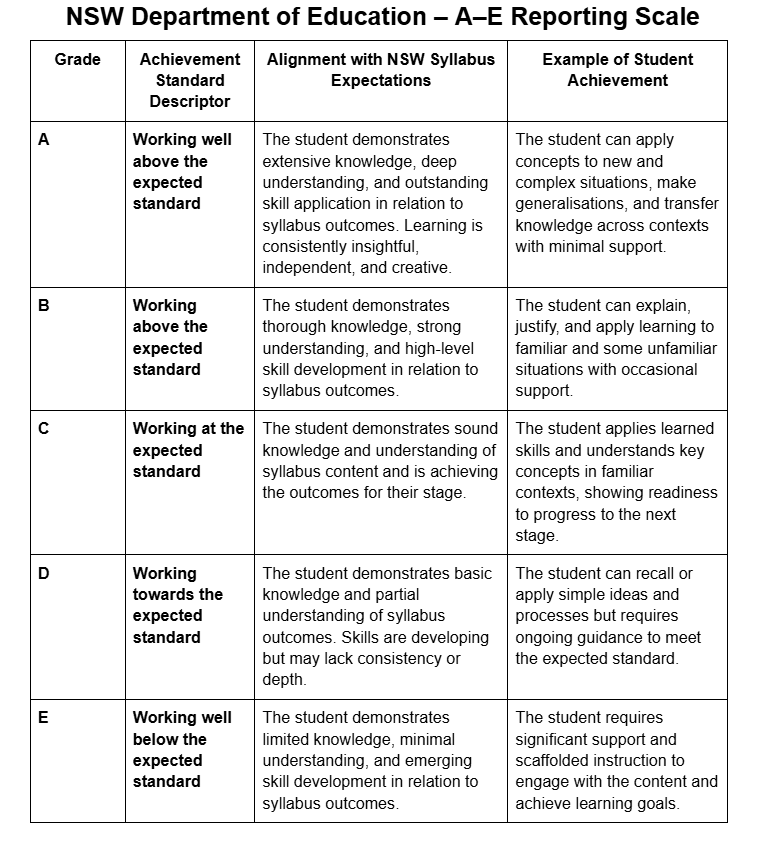 Progression points and A-E grading provide educators, leaders, and families with a transparent reference point to support fair and evidence-based reporting aligned to the NSW curriculum.