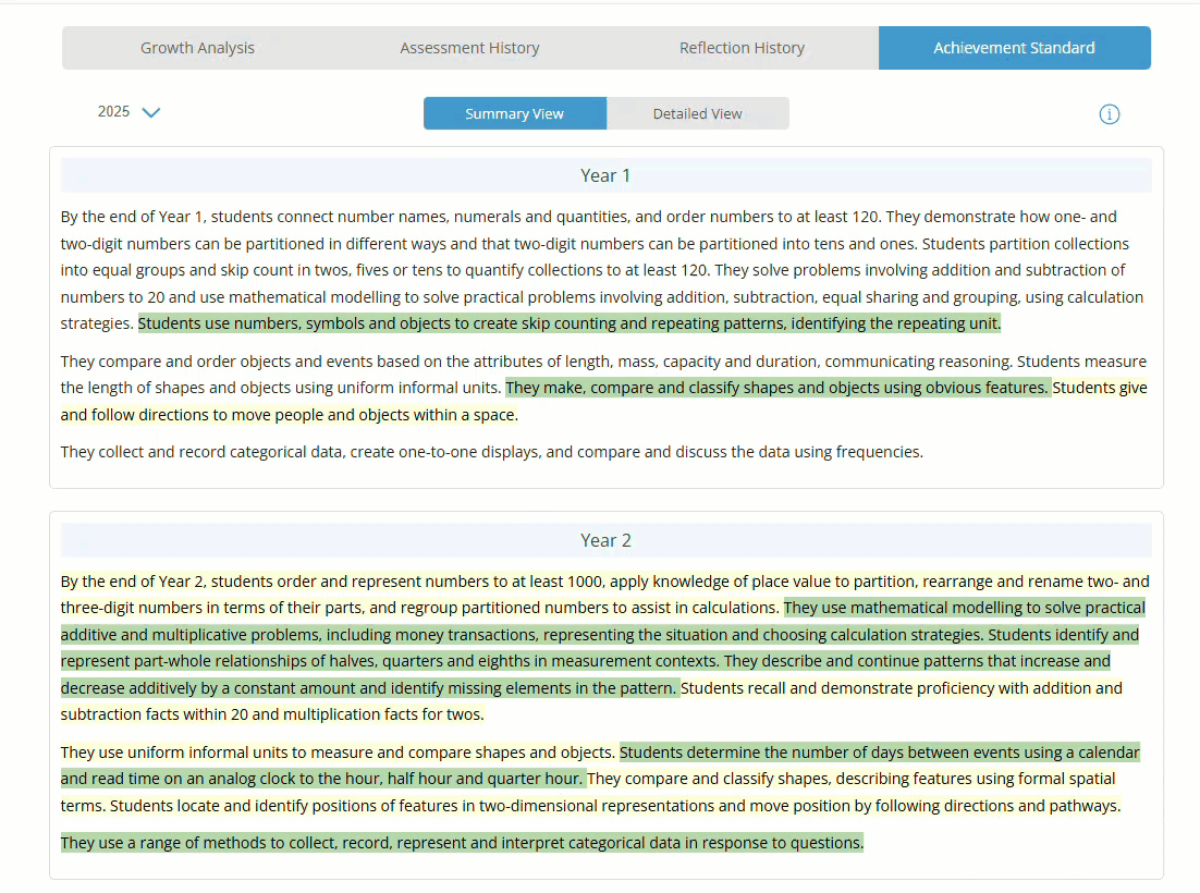 - Detailed View: the specific skills and knowledge demonstrated by the student, offering curriculum-aligned evidence to support your summary judgement.