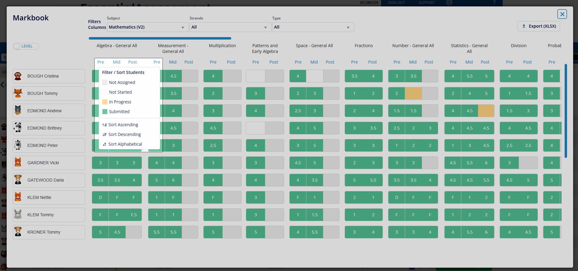 - Sort students results in ascending, descending, or alphabetical order to easily track where each student is up to