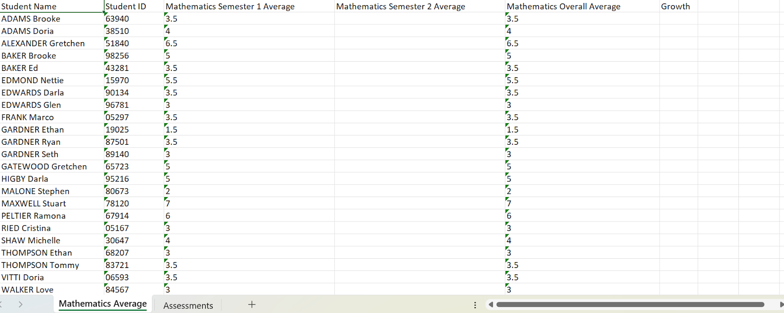 On this spreadsheet, you can select the Mathematics Average tab to view your students' Semester 1 average, Semester 2 average, and overall yearly average.