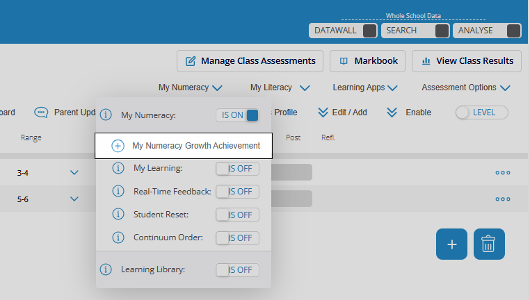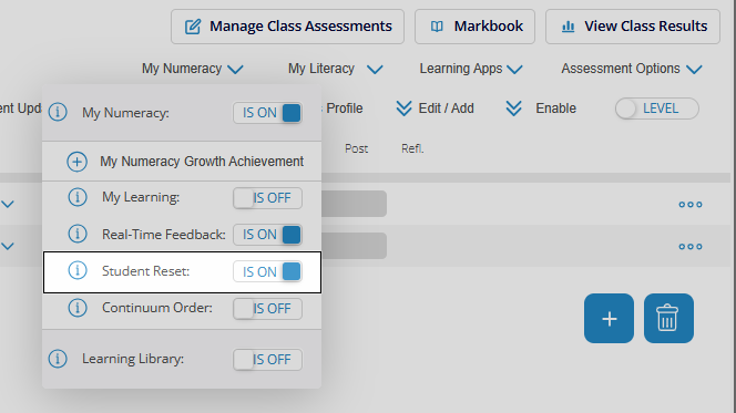 Under My Numeracy, switch the Student Reset toggle to IS ON to allow students functionality to reset their own My Numeracy activities.