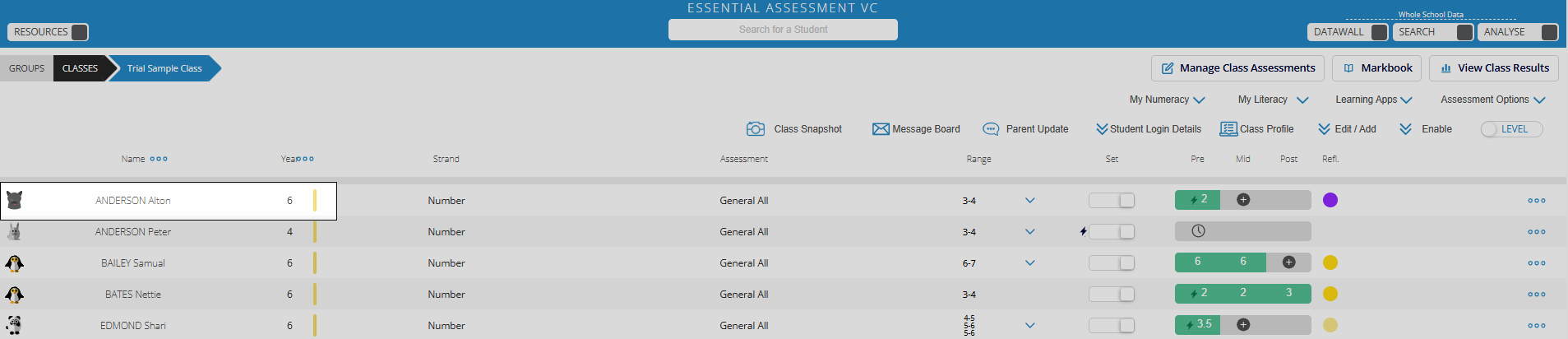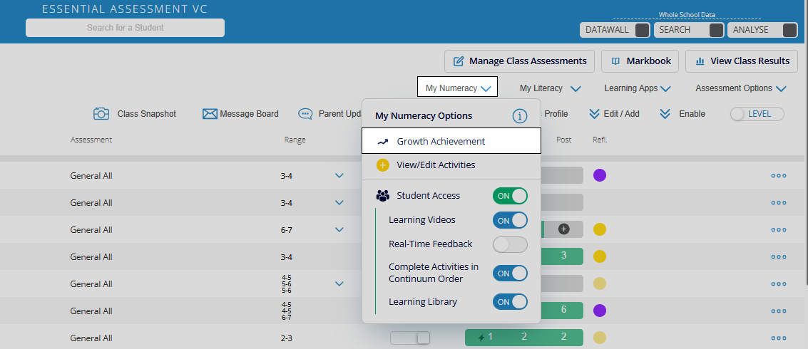 My Numeracy Growth Achievement provides you with a simple overview of all your students' achievements for My Numeracy activities. Click My Numeracy and then My Numeracy Growth Achievement.