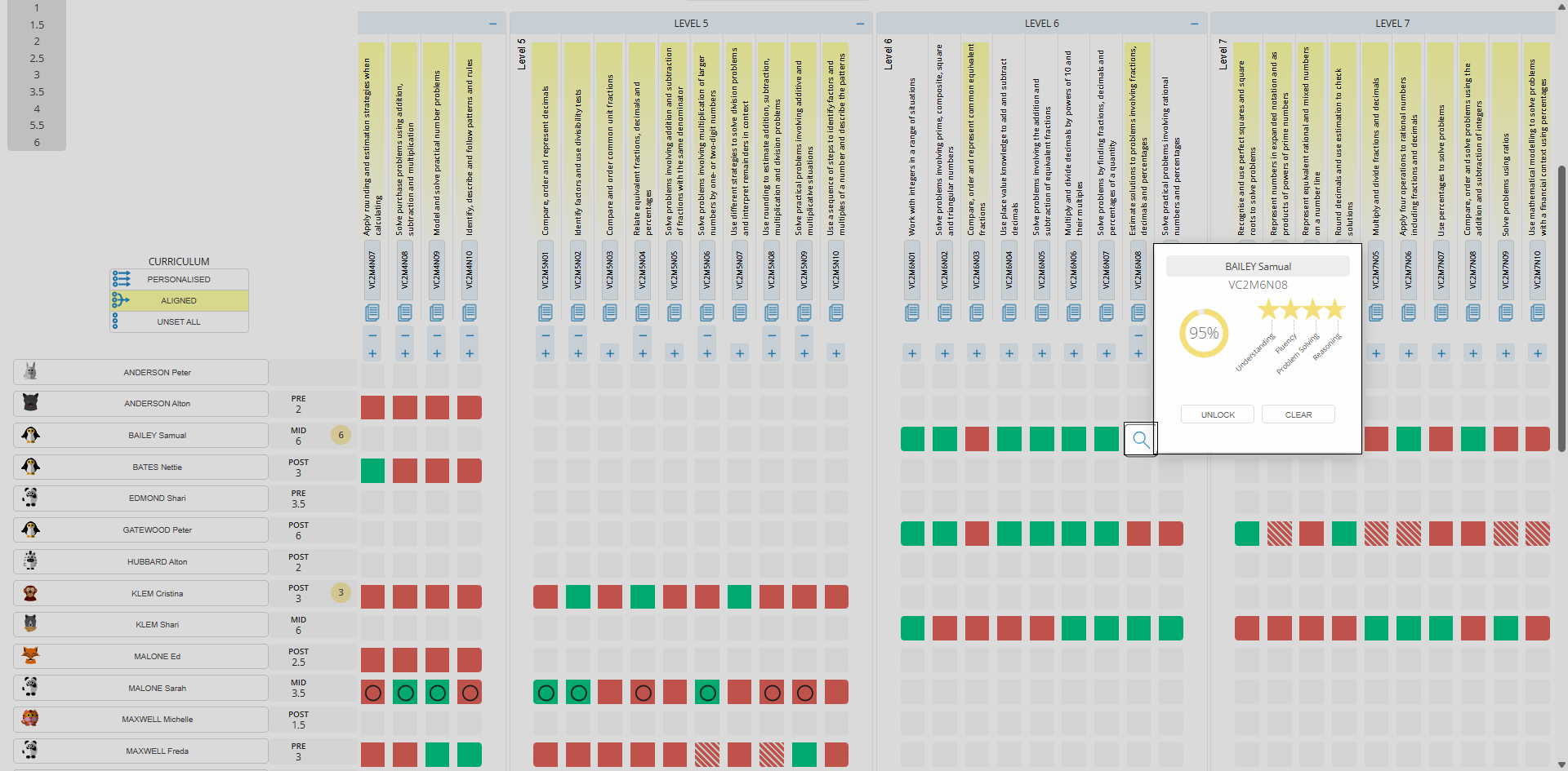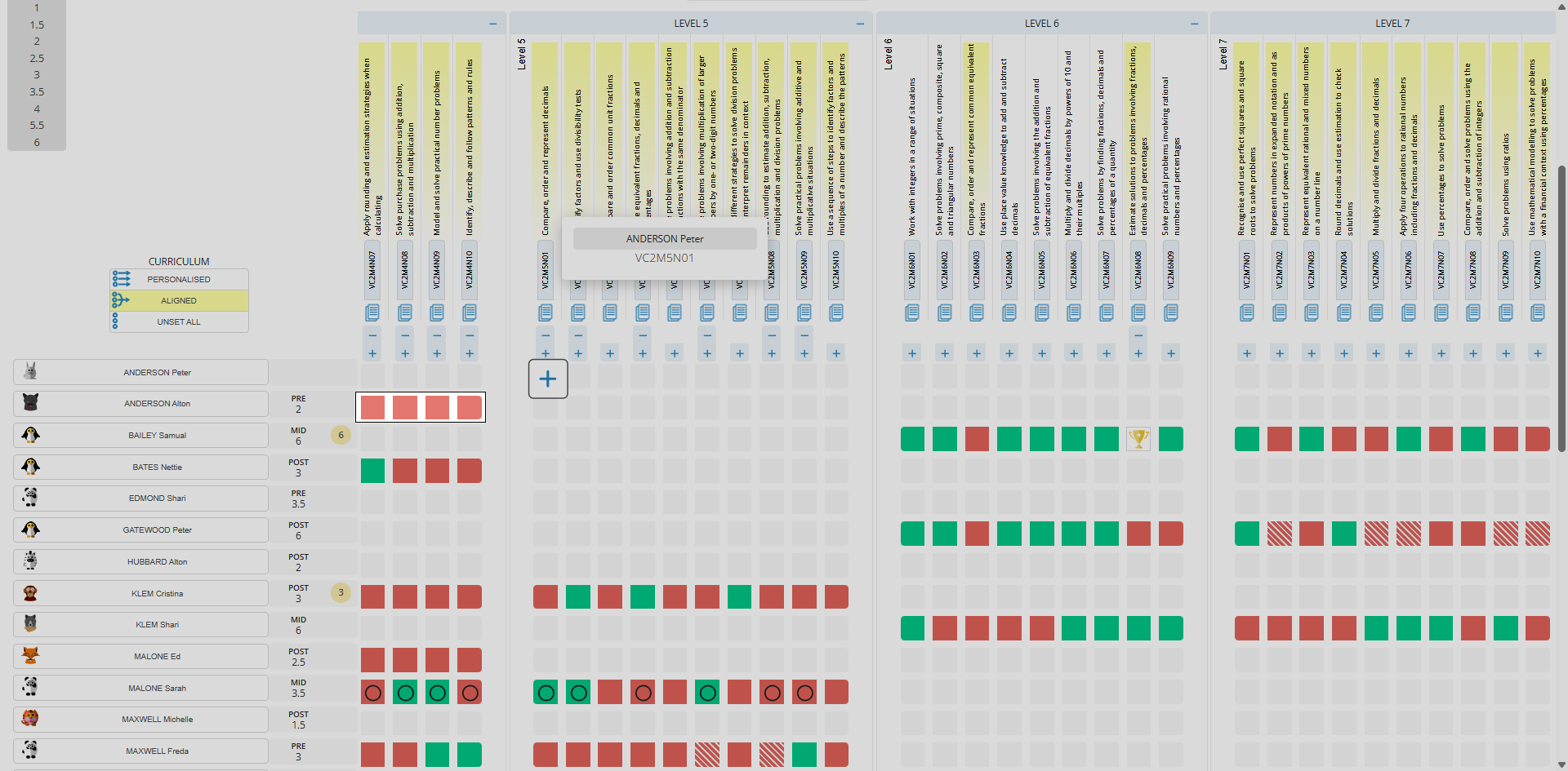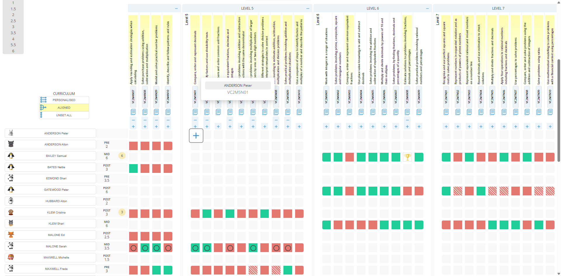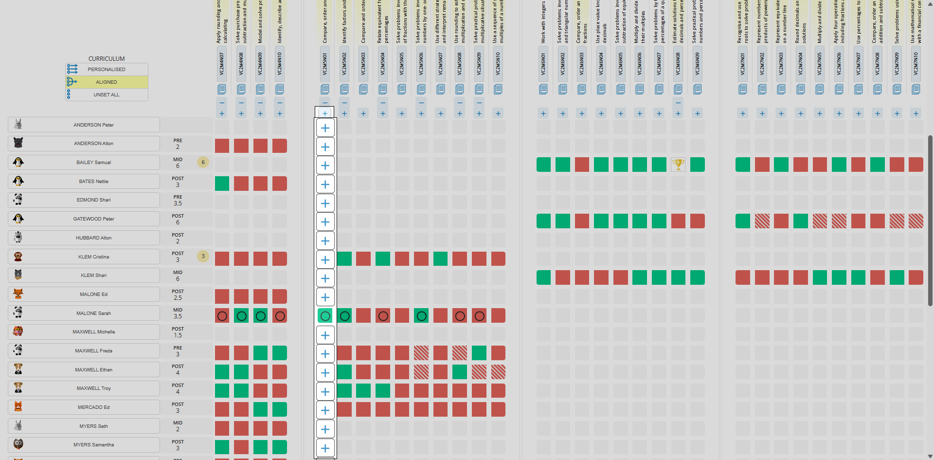 Click View Class Results and click My Numeracy under the sub-strand or topic title. A green box will appear next to a student if they have understood a content descriptor. If you would still like the student to complete the My Numeracy activity, hover over the box and click the + icon.
