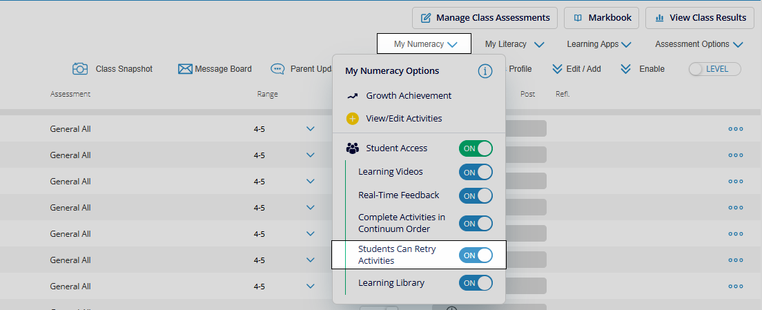 Students can reset their own My Numeracy activities if you have toggled on the 'Students can retry activities option.