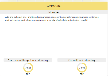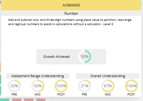 | Assessment Range Understanding | Indicates the percentage of students assigned to this assessment range (e.g. Level 1–2, 2–3) who have demonstrated understanding at PRE, MID or POST. | Appears only for assessment points that exist (PRE, MID, POST). The yellow segment represents the proportion understood. |