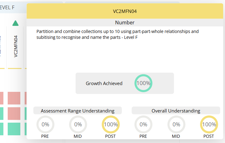 | Green Arc on Growth Indicator | Represents the increase in the percentage of students in the assessment range who now demonstrate understanding compared to earlier assessments. | Appears within the ‘Growth Achieved’ display when two assessments have been completed. |