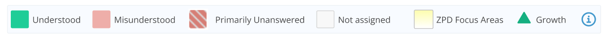 - If the student has selected more ‘I don’t know yet’ responses than incorrect answers, their result is shown as Primarily Unanswered (red diagonal stripes).