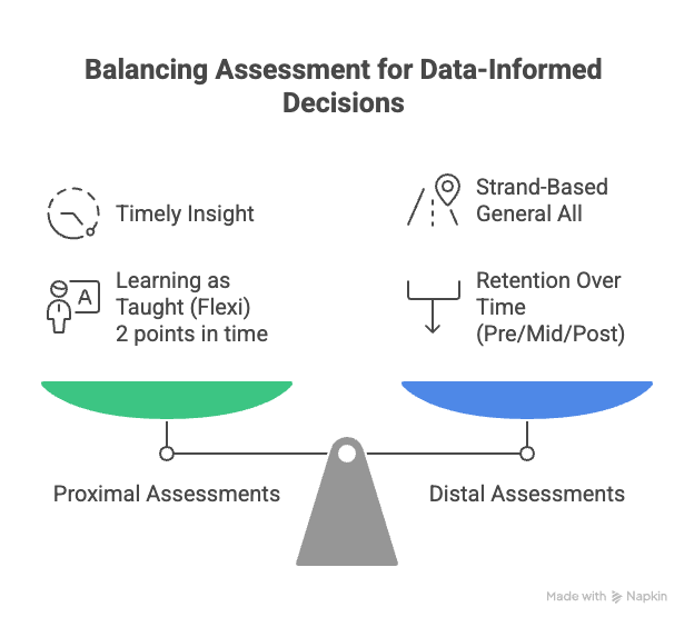 Together, proximal and distal assessments play complementary roles. Proximal assessments provide timely insight into learning as it is being taught, while distal assessments offer a light-touch, strand-based overview of what has been retained over time. Used in combination, the General Assessments support data-informed decision-making that strengthens classroom practice, guides strategic leadership, and benefits the entire learning community.
