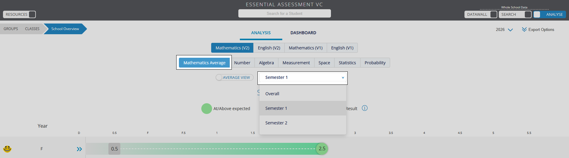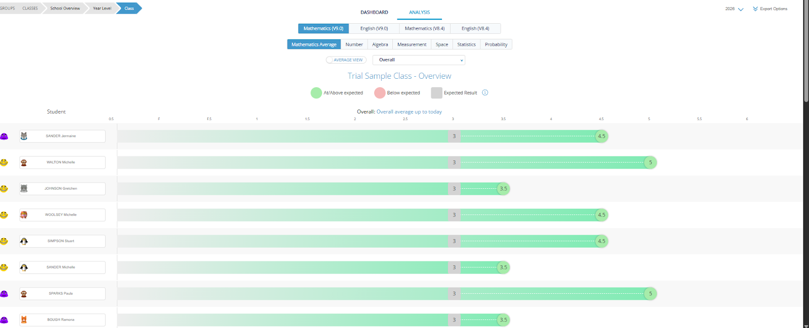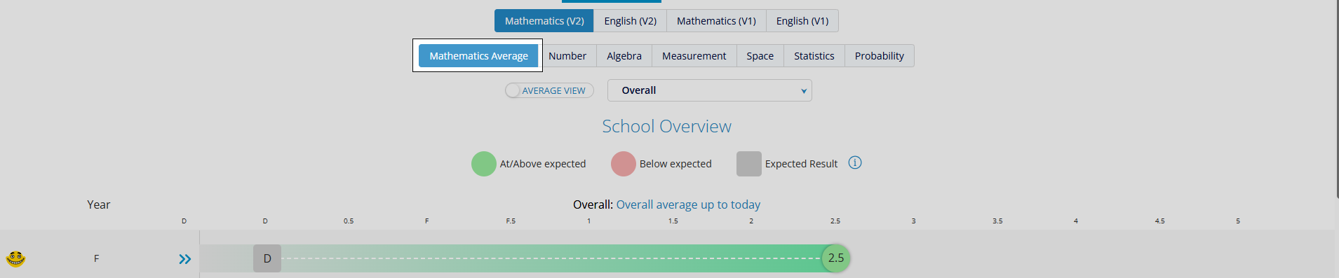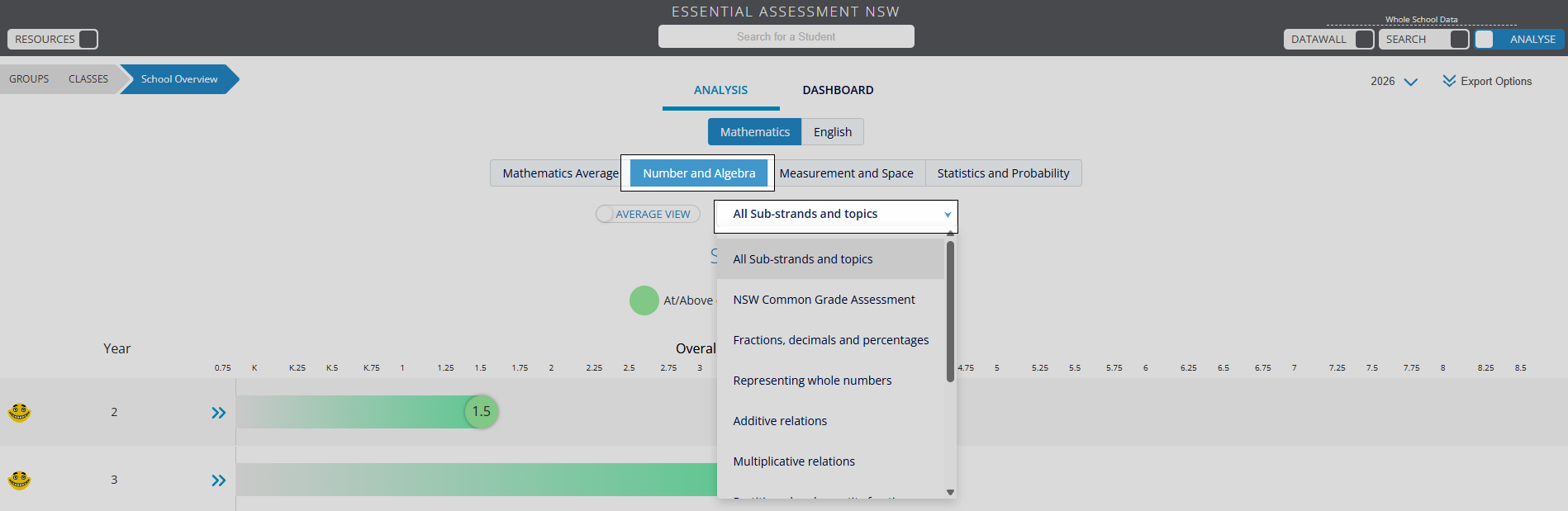 - Select to see overall subject or strand (e.g. Mathematics Average, Number, Multiplicative Strategies)
