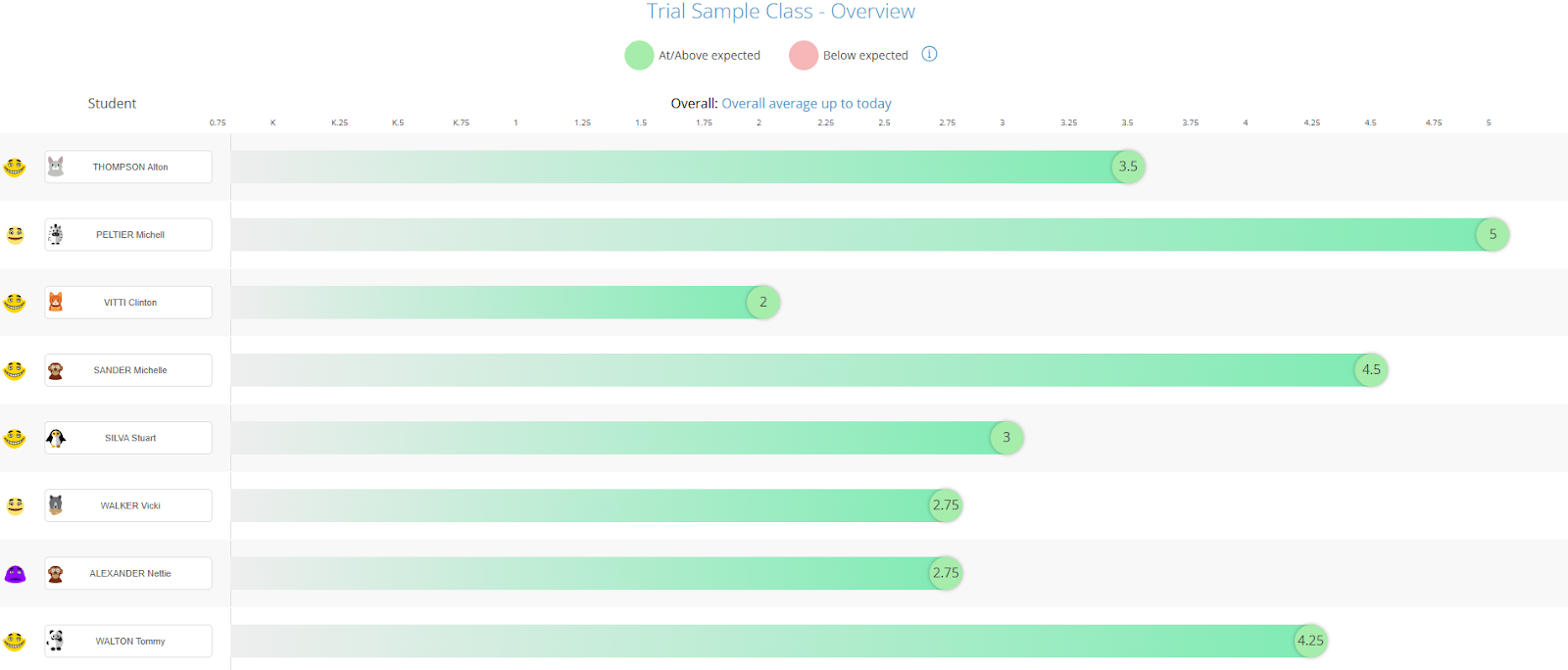 - Overall Average is the average of the latest PRE/MID/POST assessments across all strands completed up until the current date, rounded to the nearest 0.5 for AC/VC and to the nearest 0.25 for NSW.