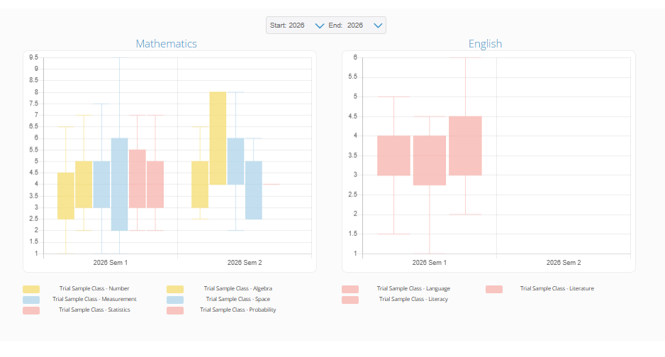 - Semester Average is the average of the latest from PRE/MID/POST assessments across all strands completed in the selected semester and rounded to the nearest 0.5 for AC/VC and to the nearest 0.25 for NSW.