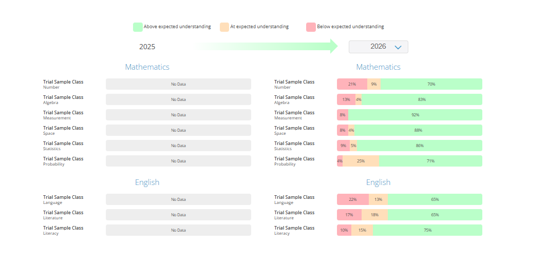 • Dashboard: Compares current years to previous years. giving a high-level snapshot of achievement and progress across subjects and strands.