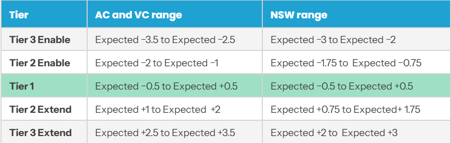 The tier band ranges differ slightly between curriculum subscriptions. AC and VC use half-point bands; NSW uses quarter-point bands because NSW Common Grade Assessment data works in finer increments.