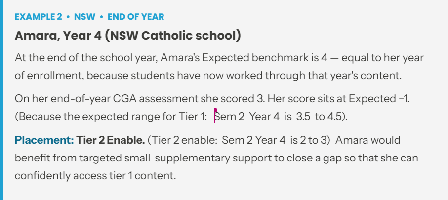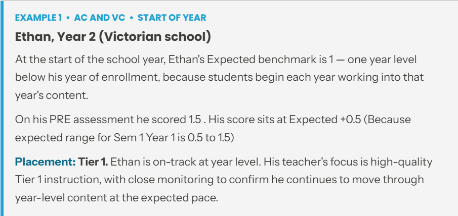 These two examples show how Expected and tier placement are applied in practice. One covers a student at the start of the year in a Victorian school; the other covers a student at the end of the year in a NSW Catholic school.
