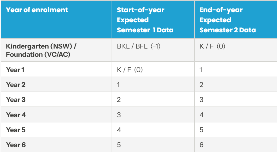 At the start of the school year, Expected is one year level below the year of enrolment. This reflects that students are entering content they have not yet been taught.